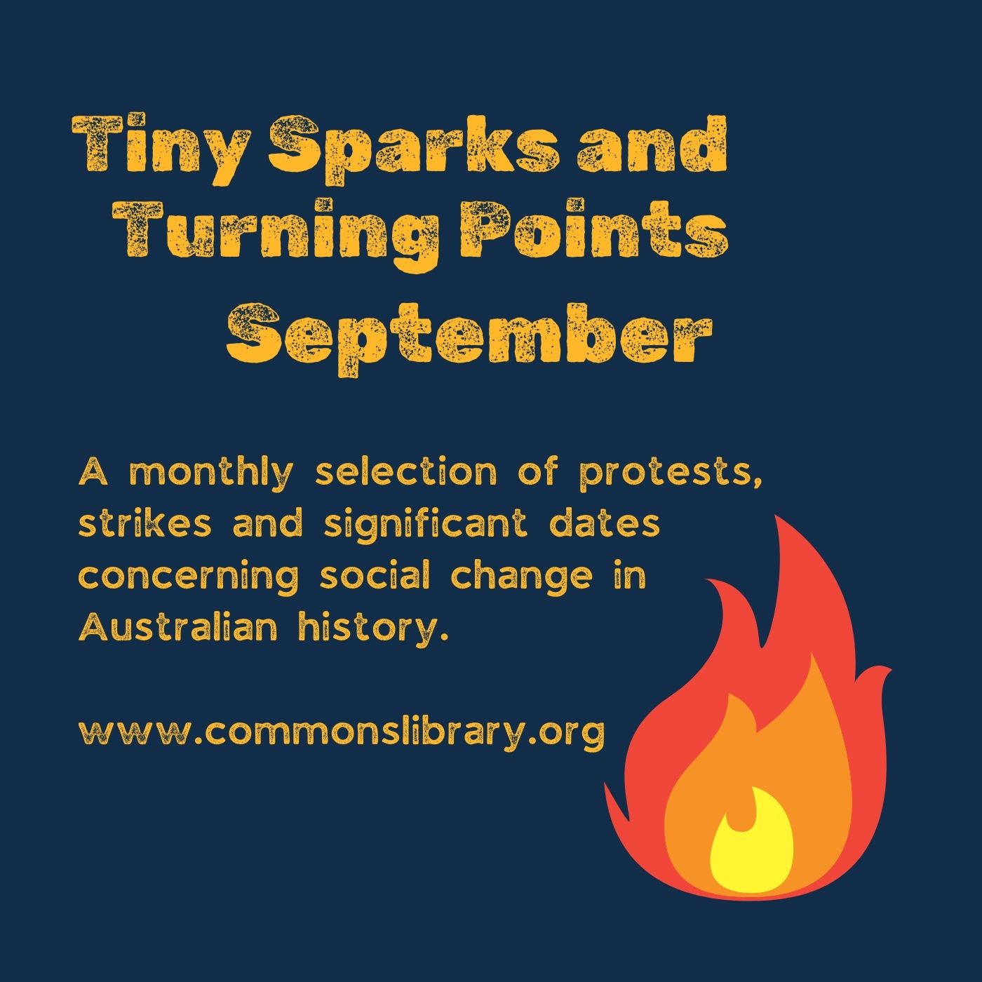 Tiny Sparks and Turning Points is a monthly selection of protests, strikes and significant dates concerning social change in Australian history. It goes to air on the first Monday of each month on 3CR at 8am.