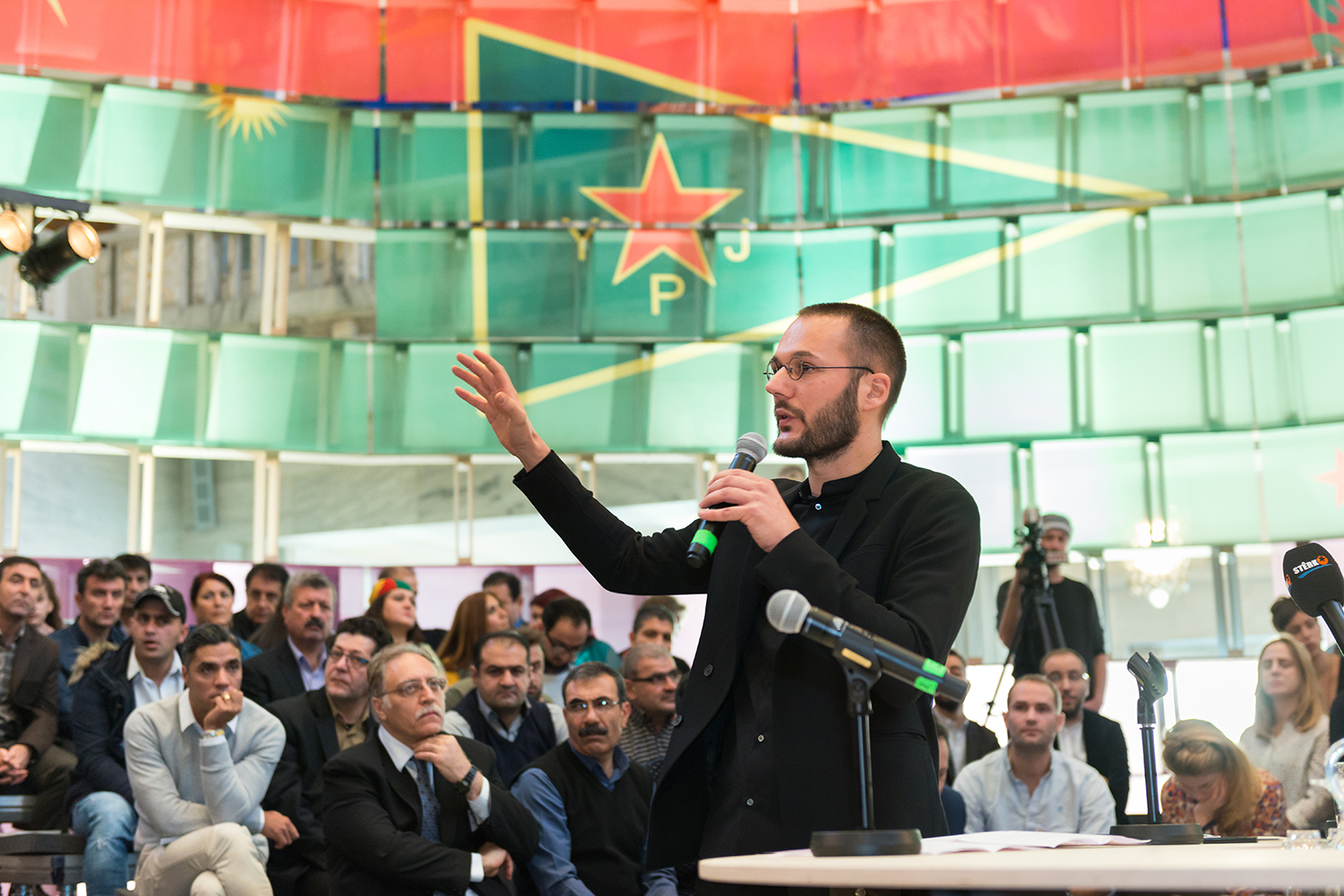 Pictured: Artist Jonas Staal inside the New World Embassy: Rojava (2016) at the Oslo City Hall, Oslo Architecture Triennale: After Belonging/ORO-KURO, Norway. Photo Istvan Virag