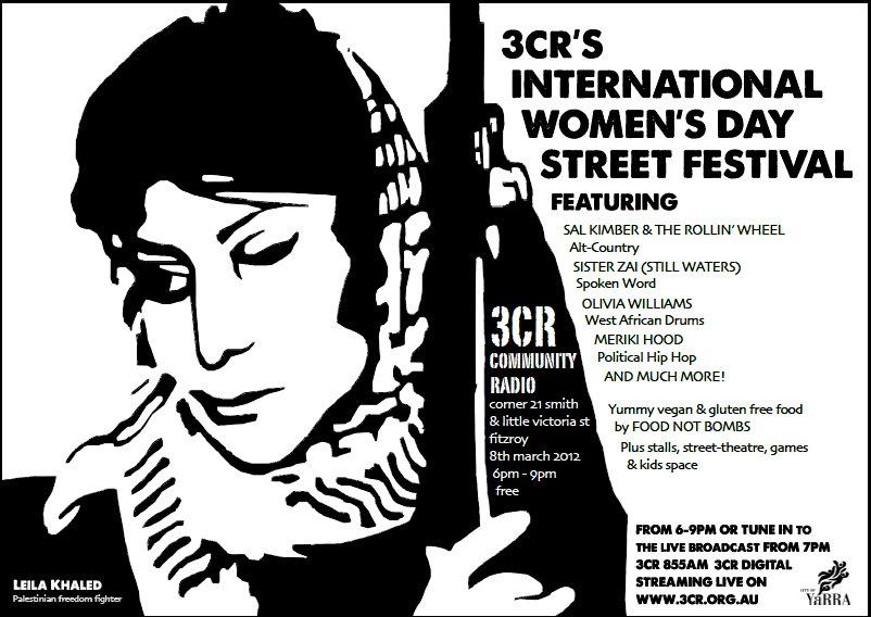 In 2012 3CR is celebrating International Women's Day with 24 hours of women's only radio as well as a street party and live outside broadcast. Tune in on Thursday 8 March for diverse and radical women's voices on the airwaves - current affairs, science, music, poetry, books, human rights, music, laughter and much more will be part of the feast of women's talents and voices on 3CR 855AM, 3CR Digital and 3cr.org.au