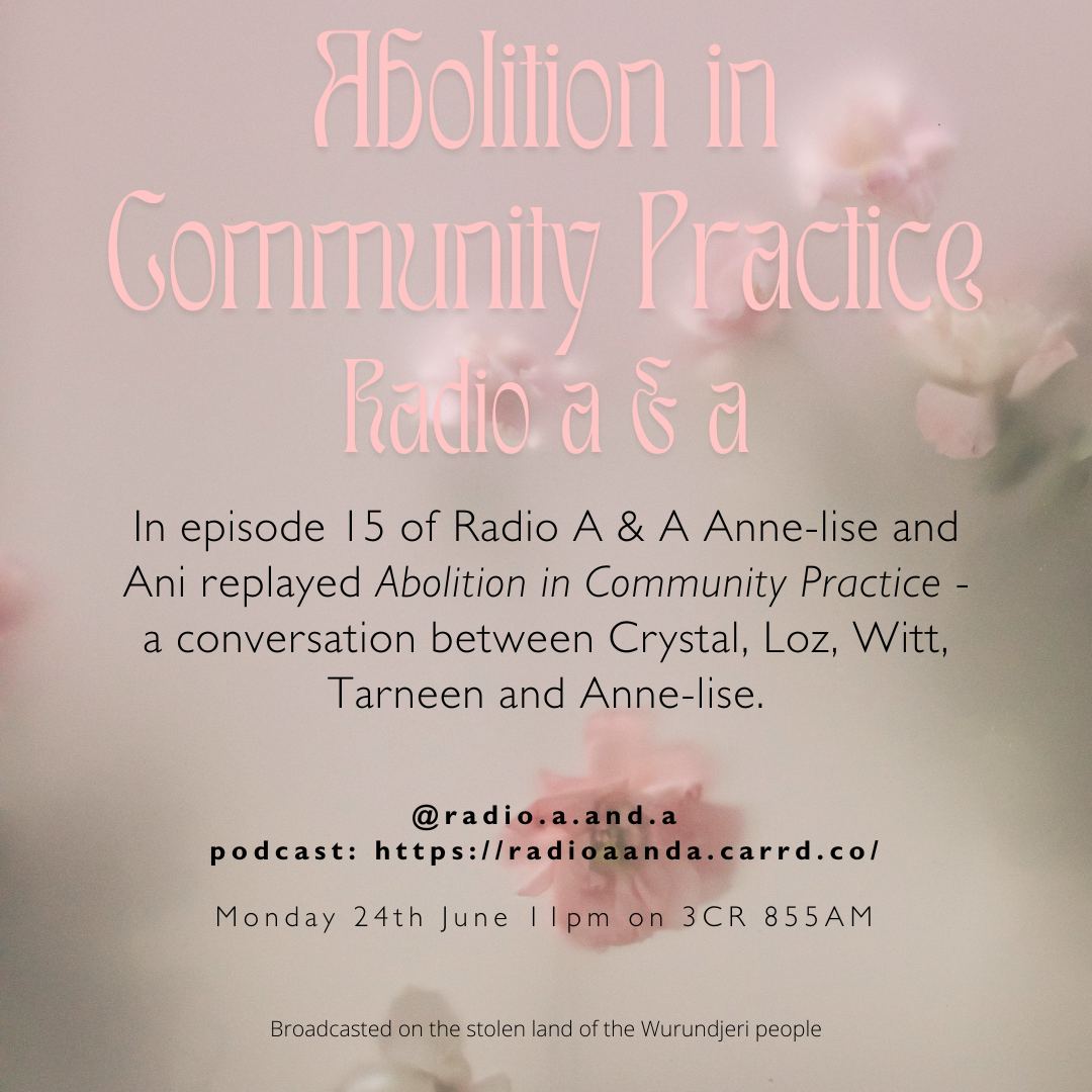 In episode 15 of Radio A & A Anne-lise and Ani replayed Abolition in Community Practice - a conversation between Crystal, Loz, Witt, Tarneen and Anne-lise.