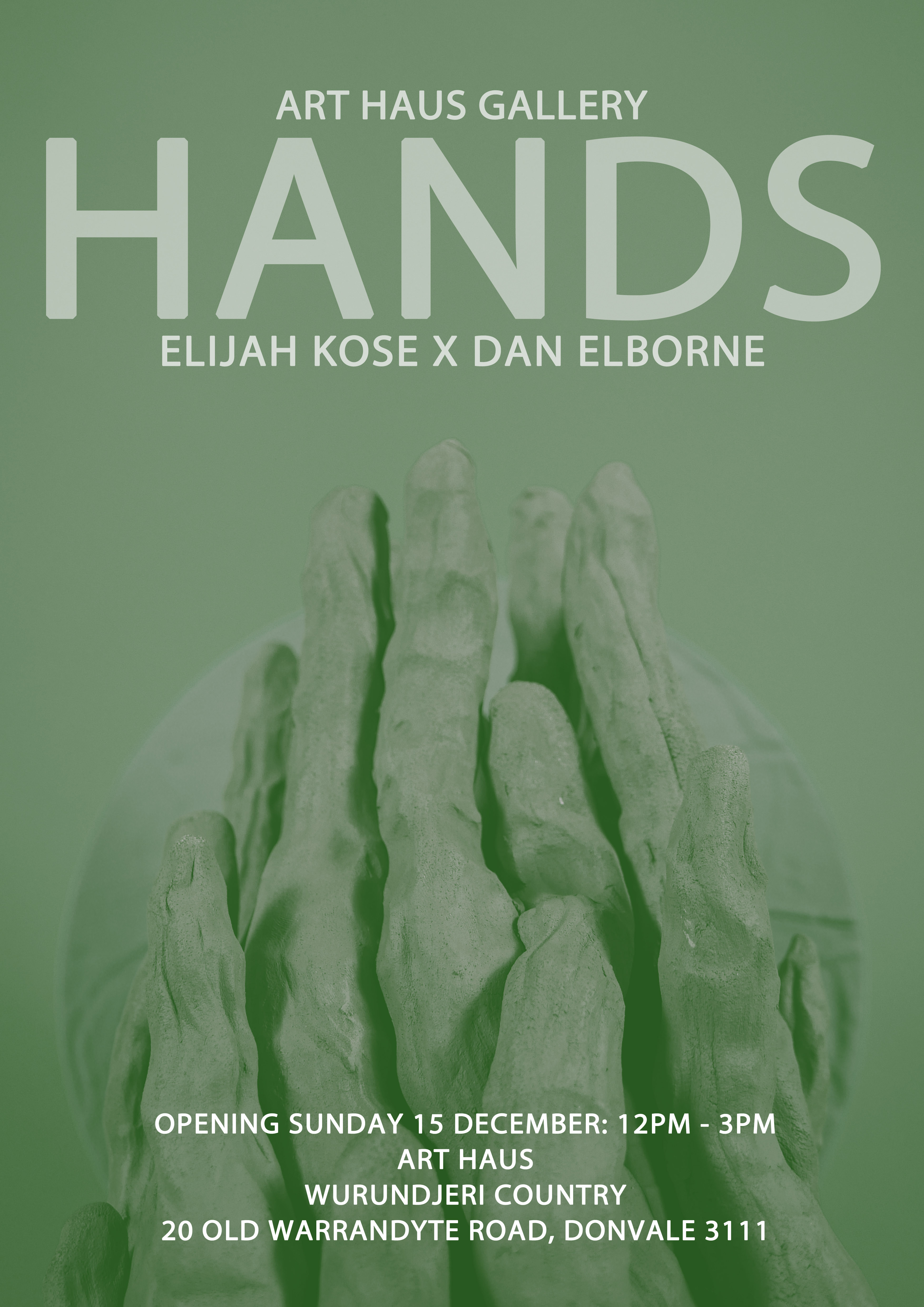 Hands opens on Elijah's birthday, Sunday 15 December, 12-3PM at Art Haus Gallery on Wurundjeri Country, 20 Old Warrandyte Road, Donvale.//