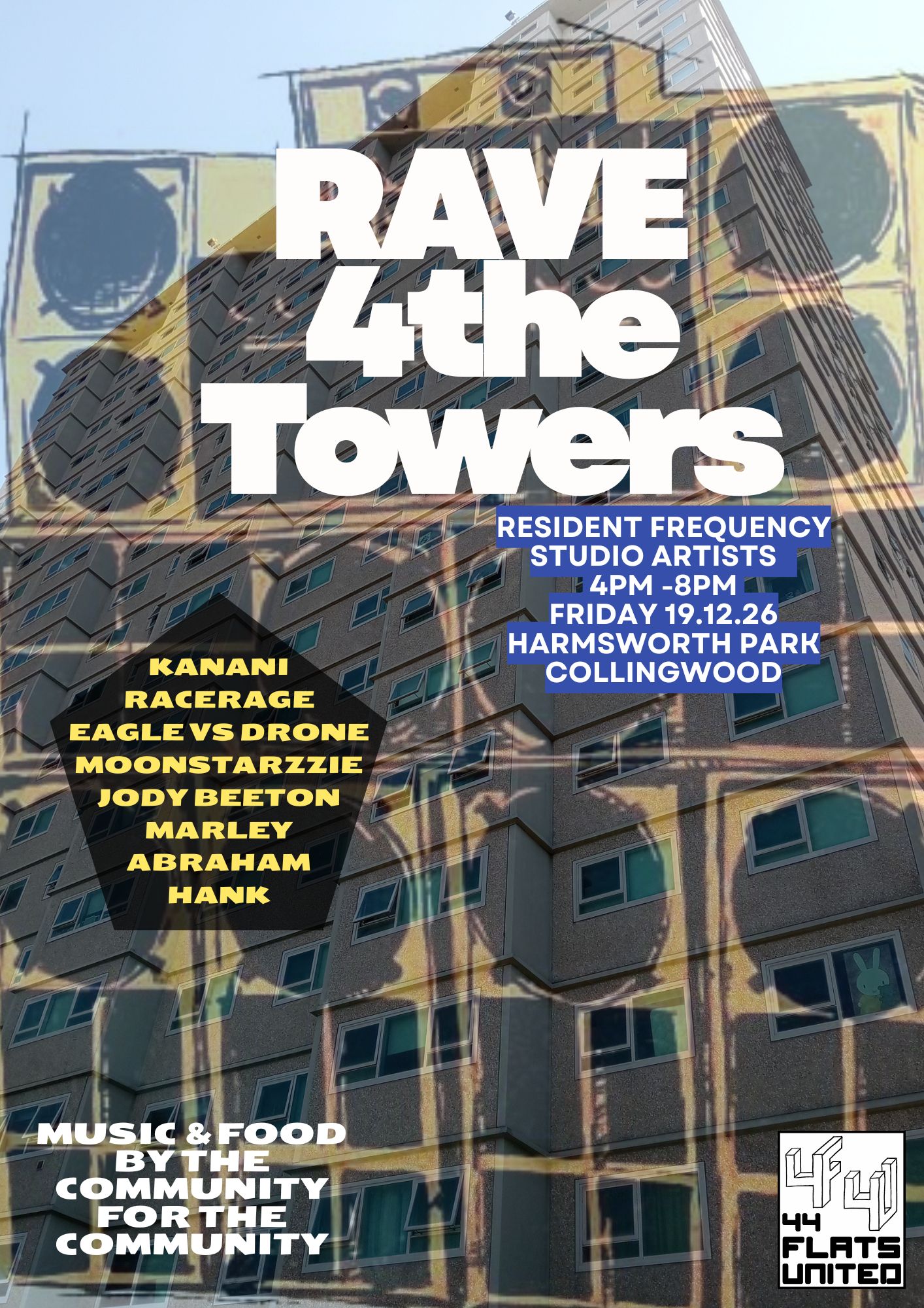 Maurice/Moonstarzzie from Resident Frequency Studio joined us live in-studio to discuss Rave 4 the Towers, a day of music and food by the community for the community, in solidarity with public housing residents in the 44 flats. Rave 4 the Towers is from 4-8pm on Friday 19th December, at Harmsworth Park in Collingwood.//