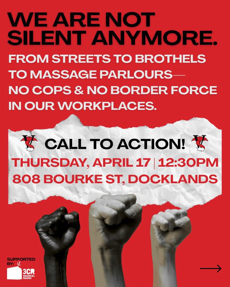 Bee is a migrant sex worker, outreach peer support worker for women of cultural and linguistically diverse backgrounds for Vixen and AMSWAG (Asian Migrant Sex Worker Advisory Group) under the Scarlet Alliance. They are also a member of Justice for Our Sisters. Bee talks to us today about Operation Inglenook and the recent increase in ABF raids targeting Asian-migrant sex workers, and the upcoming action on Thursday 17th April outside 808 Bourke St. For more information, please go to @vixenworkers on Instagram. Join the email campaign to end racist immigration raids here.